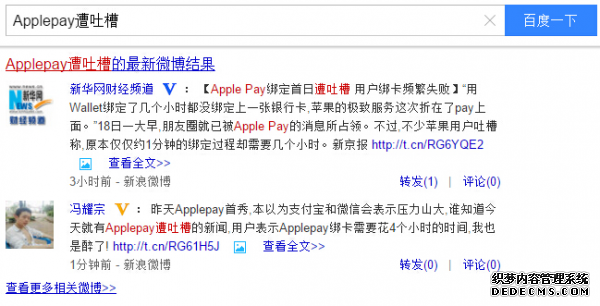 微博更適合做熱點事件推廣或營銷,比如今天有新聞報道Applepay遭吐槽的事件,我馬上上微博發(fā)了一條微博內(nèi)容,并且附上了我的報道鏈接,2分鐘后排名上了首頁,而這個關(guān)鍵詞的搜索熱度是60多萬,1個小時左右,這條微博已經(jīng)為我的文章引流4000多IP了。