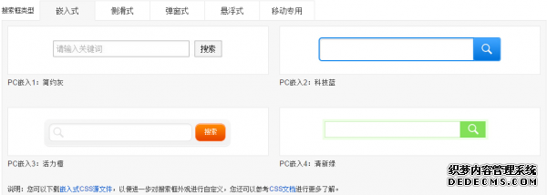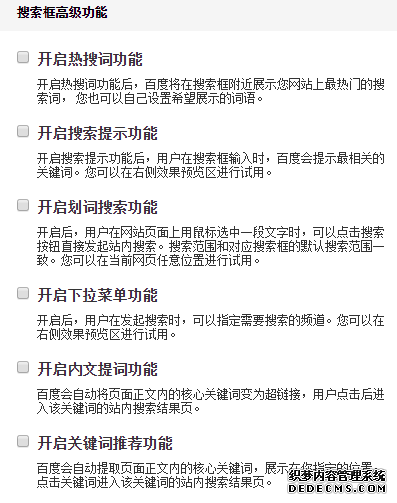 4、關(guān)于搜索框高級(jí)功能右側(cè)可以直接預(yù)測(cè)演示效果,選中以后,右側(cè)可以直接看到效果,當(dāng)然根據(jù)你網(wǎng)站的自身寬度、樣式來選擇一個(gè)合理的效果,一般開啟下拉、熱詞搜索、內(nèi)文提詞這三個(gè)功能即可。