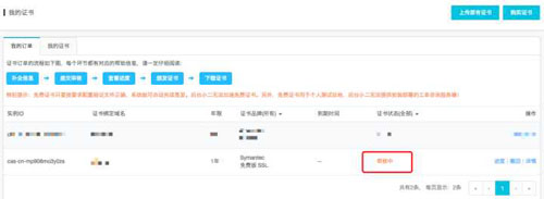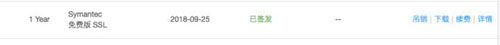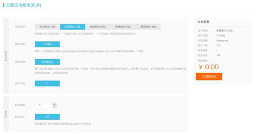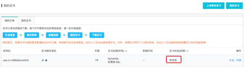 (4)選擇“免費(fèi)型DV SSL”,并點(diǎn)擊立即購買。購買成功后跳轉(zhuǎn)到“我的證書”頁面: