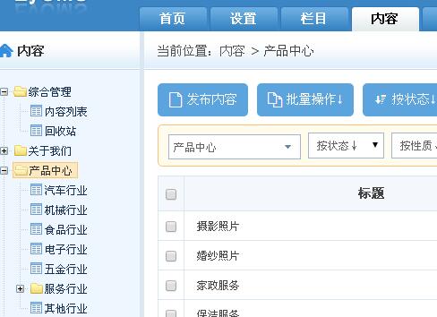 首先選擇【內(nèi)容】欄,找到【產(chǎn)品中心】選擇要發(fā)布到的分類,點(diǎn)擊【發(fā)布內(nèi)容】