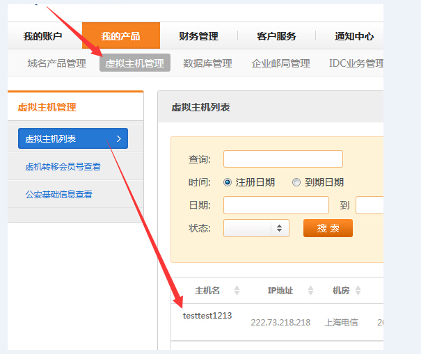 一、登錄會(huì)員號(hào)以后,在管理首頁(yè)導(dǎo)航中點(diǎn)擊“我的產(chǎn)品”,進(jìn)入“虛擬主機(jī)管理”查看相應(yīng)已開(kāi)通的虛擬主機(jī)產(chǎn)品