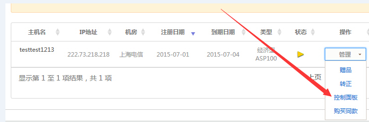 點(diǎn)擊對(duì)應(yīng)虛擬主機(jī)名稱(chēng)的“管理”;,在下拉菜單中點(diǎn)擊“控制面板”進(jìn)入相應(yīng)的管理頁(yè)面。