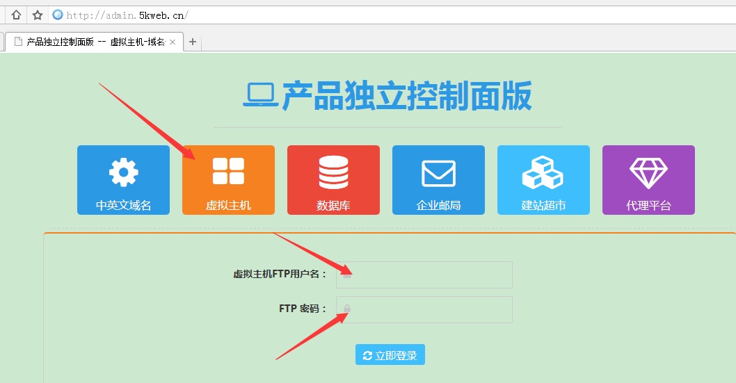 主機(jī)管理控制面板也可以通過(guò)登錄獨(dú)立的控制面板地址admin.5kweb.cn登錄管理,如下圖: