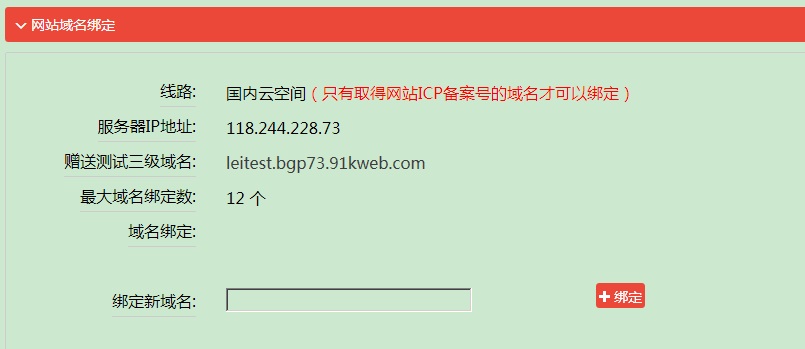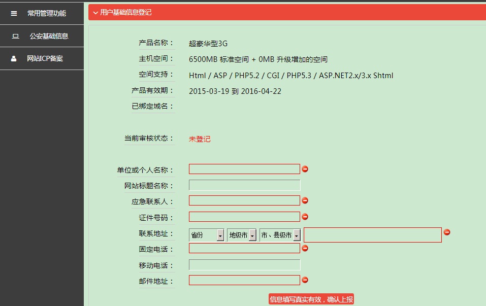 國(guó)外空間,域名不需要備案,直接在“網(wǎng)站域名綁定”中綁定對(duì)應(yīng)域名即可。如果是國(guó)內(nèi)空間,域名先要備案成功后才能綁定使用,如果網(wǎng)站沒(méi)有填寫(xiě)公安基礎(chǔ)信息,綁定時(shí)會(huì)有提示,要求先填寫(xiě)相應(yīng)的信息,如下圖: